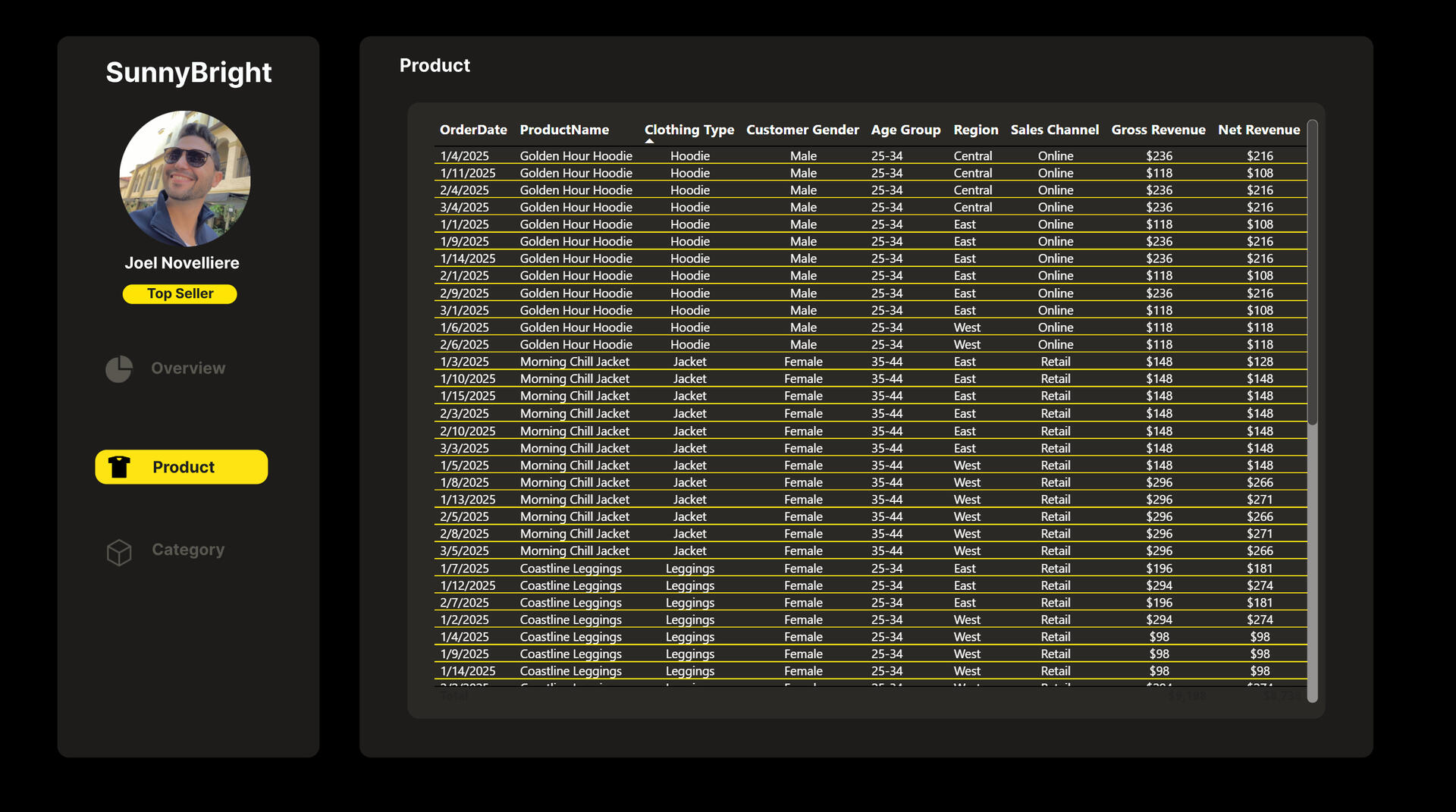This project analyzes a fictional direct-to-consumer apparel brand, SunnyBright, to demonstrate how transactional sales data can be modeled and analyzed to produce clear, decision-ready revenue insights. Using SQL, a dimensional data model, and Power BI, the analysis focuses on product- and category-level performance across gross revenue, net revenue, and units sold to show how raw data can be transformed into a scalable analytics solution for leadership reporting.Key investment questions addressed in this analysis: