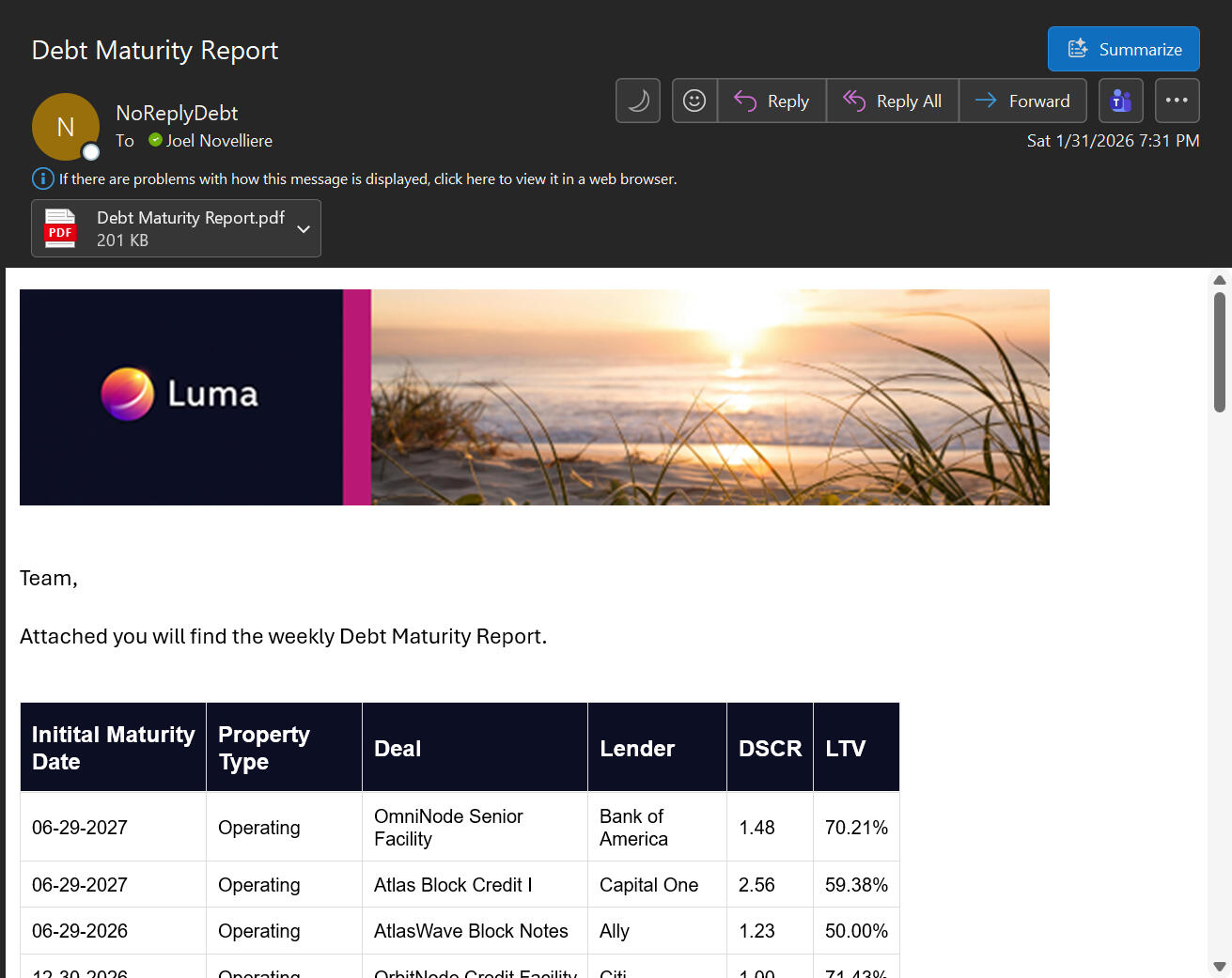 6) Sent weekly portfolio risk emails via Power Automate.Core conclusions:1) Portfolio leverage is generally moderate, though risk is unevenly distributed across a subset of higher-leverage facilities.2) Cash-flow coverage varies by property type, with operating assets showing stronger coverage than development properties.3) Risk is concentrated around upcoming maturities and extensions, where refinancing and execution risk is highest.