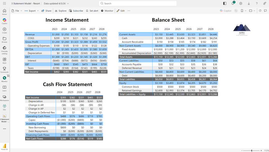 This project models ALPEX Mountain Resort using Power BI to show how cash flows and operational performance drive returns across the forecast period, bringing full transparency to resort economics and capital efficiency.
