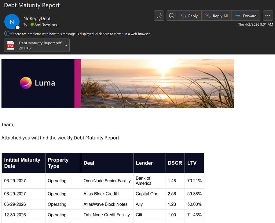 6) Sent weekly portfolio risk emails via Power Automate.Core conclusions:1) Portfolio leverage is generally moderate, though risk is unevenly distributed across a subset of higher-leverage facilities.2) Cash-flow coverage varies by property type, with operating assets showing stronger coverage than development properties.3) Risk is concentrated around upcoming maturities and extensions, where refinancing and execution risk is highest.