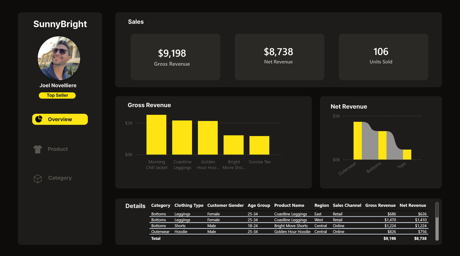 This project analyzes a fictional direct-to-consumer apparel brand, SunnyBright, to demonstrate how transactional sales data can be modeled and analyzed to produce clear, decision-ready revenue insights. Using SQL, a dimensional data model, and Power BI, the analysis focuses on product- and category-level performance across gross revenue, net revenue, and units sold to show how raw data can be transformed into a scalable analytics solution for leadership reporting.Key investment questions addressed in this analysis: