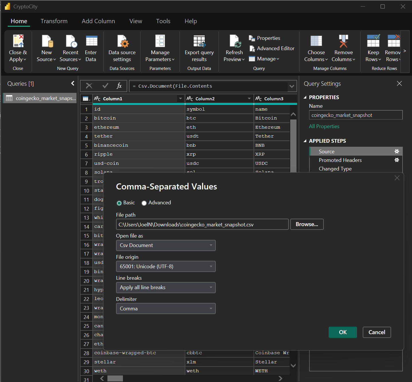 4) How far are prices from all-time highs?This analysis was built using the following approach1) Pulled live cryptocurrency market data via Coingecko API using Python.2) Structured core pricing metrics including current price, market cap, 24-hour low, and 24-hour high into analytical dataframes.3)Calculated derived fields comparing current price to all-time highs to quantify relative performance.4) Applied basic validation and normalization to ensure consistent metrics across assets.5) Exported the transformed dataset to CSV and Excel for reporting and downstream consumption.6) Designed the data structure to support paginated reports, sparklines, and snapshot-based refreshes.Core conclusions:1) Short-term price behavior varies significantly across assets, with some cryptocurrencies trading near daily highs while others show wide intraday ranges, indicating elevated volatility.2) Market capitalization provides essential context alongside price, as assets with similar prices can represent vastly different market sizes and risk profiles.3) Many assets remain meaningfully below their all-time highs, highlighting the extent of prior market drawdowns and the uneven pace of recovery across the crypto landscape.