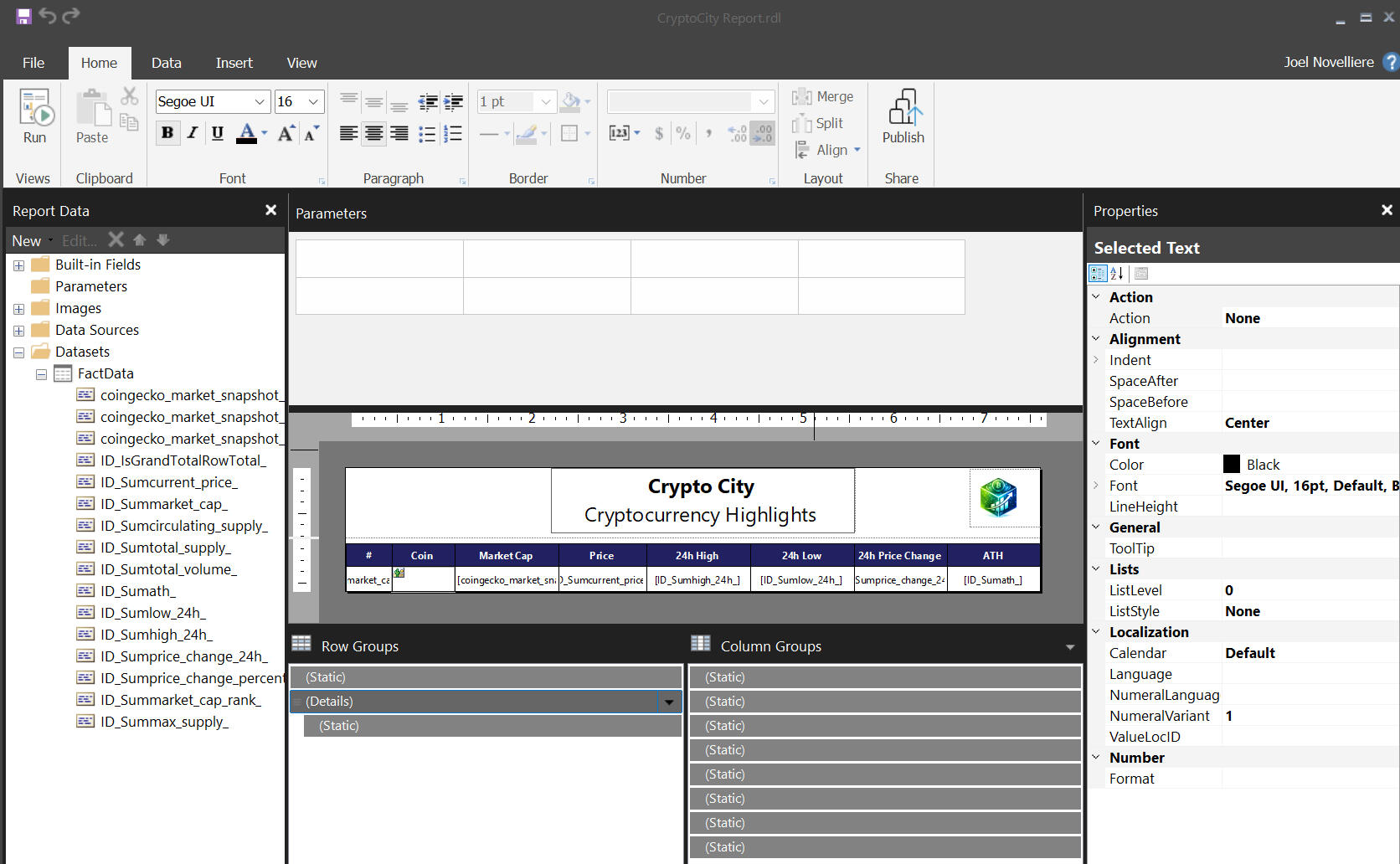 4) How far are prices from all-time highs?This analysis was built using the following approach1) Pulled live cryptocurrency market data via Coingecko API using Python.2) Structured core pricing metrics including current price, market cap, 24-hour low, and 24-hour high into analytical dataframes.3)Calculated derived fields comparing current price to all-time highs to quantify relative performance.4) Applied basic validation and normalization to ensure consistent metrics across assets.5) Exported the transformed dataset to CSV and Excel for reporting and downstream consumption.6) Designed the data structure to support paginated reports, sparklines, and snapshot-based refreshes.Core conclusions:1) Short-term price behavior varies significantly across assets, with some cryptocurrencies trading near daily highs while others show wide intraday ranges, indicating elevated volatility.2) Market capitalization provides essential context alongside price, as assets with similar prices can represent vastly different market sizes and risk profiles.3) Many assets remain meaningfully below their all-time highs, highlighting the extent of prior market drawdowns and the uneven pace of recovery across the crypto landscape.