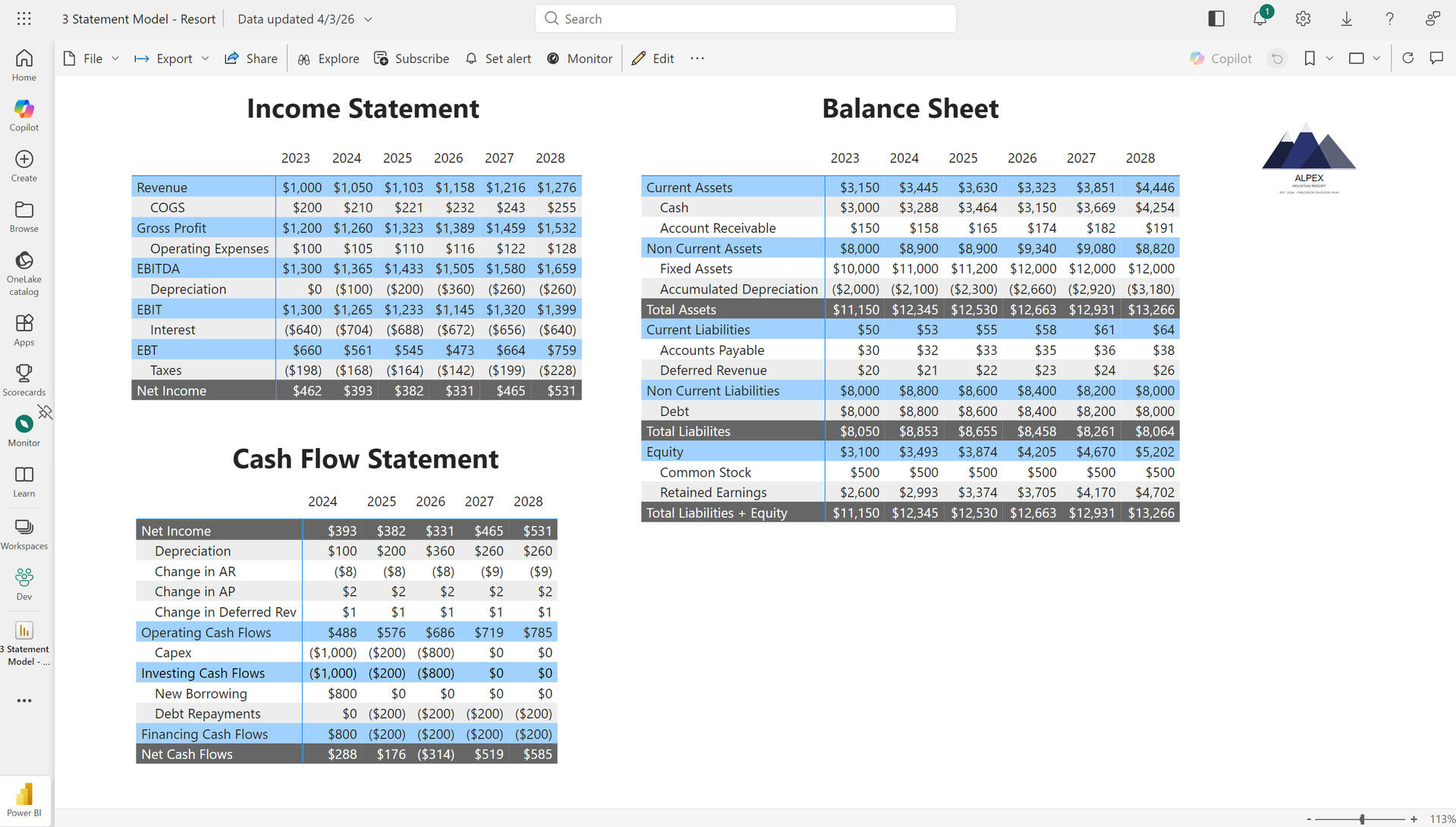This project models ALPEX Mountain Resort using Power BI to show how cash flows and operational performance drive returns across the forecast period, bringing full transparency to resort economics and capital efficiency.