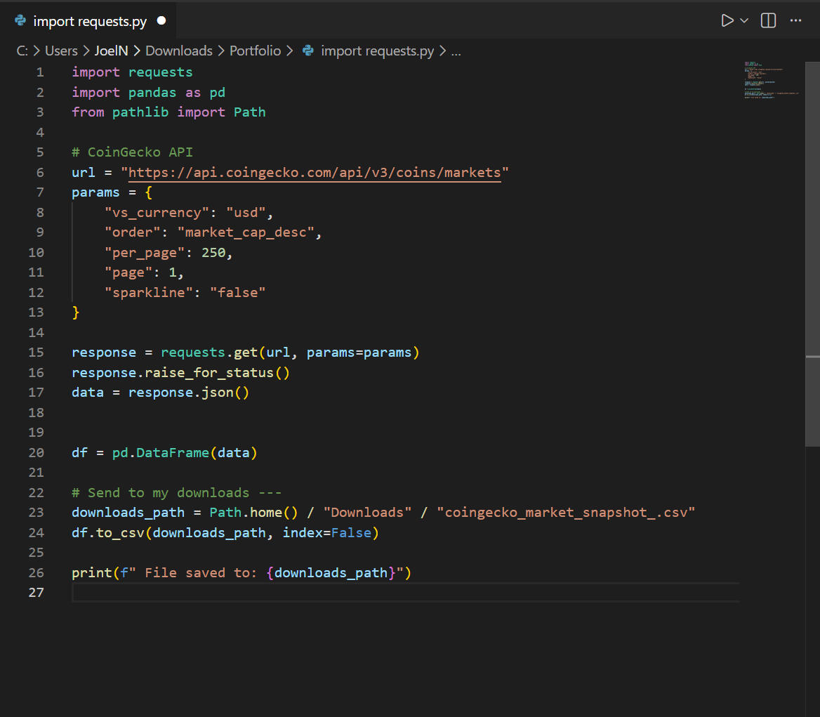 This project provides a concise snapshot of cryptocurrency market conditions, highlighting how pricing, market capitalization, and short-term trading ranges can be captured, structured, and surfaced for quick analysis. Using Python to pull real-time market data via API, the project focuses on transforming raw crypto pricing information into a clean, report-ready dataset that enables rapid comparison across assets. The analysis emphasizes current price positioning, 24-hour volatility, and performance relative to all-time highs to support lightweight monitoring and high-level market awareness rather than long-term forecasting.Key investment and risk questions addressed in this analysis1) How does price compare to the 24-hour range?